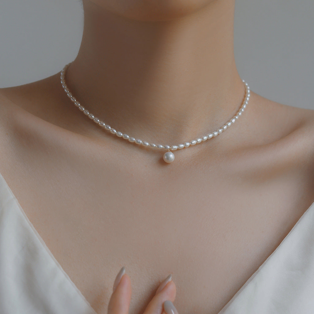 This necklace features a single, dainty freshwater pearl pendant, showcasing pearls ranging from 3mm to 5mm in size. The pearls' petite nature adds a touch of charm and refinement to the piece, while their natural luster radiates a subtle glow. Each pearl's unique character is celebrated, creating a necklace that's both refined and distinct.