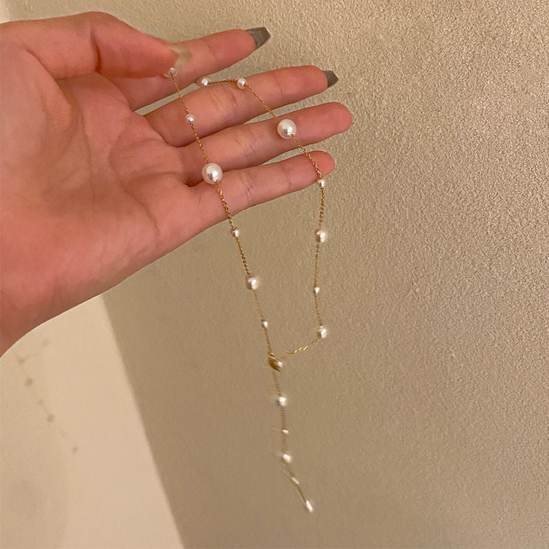Presentamos nuestra elegante cadena para clavícula: una deliciosa combinación de sencillez y frescura que añade un toque de sofisticación a cualquier atuendo. Este collar de perlas tachonadas de acero de titanio presenta un diseño único con encantadores adornos en forma de estrella y delicadas borlas que transmiten una sensación de fantasía y gracia.