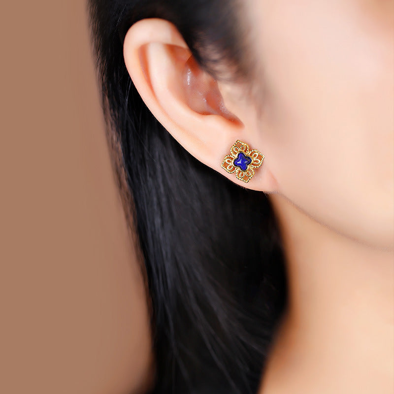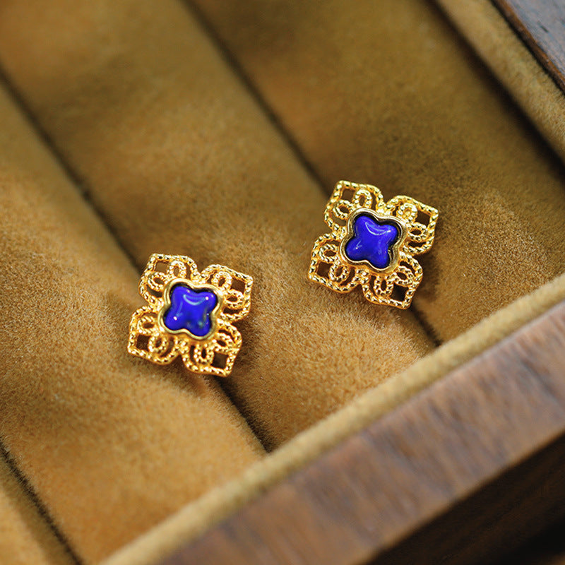 Pendientes pequeños con forma de trébol de cuatro hojas ahuecados con incrustaciones de oro y lapislázuli bañados en plata S925