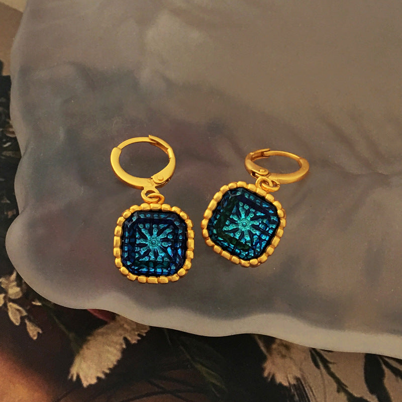 These unique earrings boast an artistic and edgy design, featuring irregular flower patterns in a striking blue hue. The fusion of European and American styles gives them a touch of vintage charm, making them a perfect statement piece for fashion-forward individuals who appreciate avant-garde aesthetics.