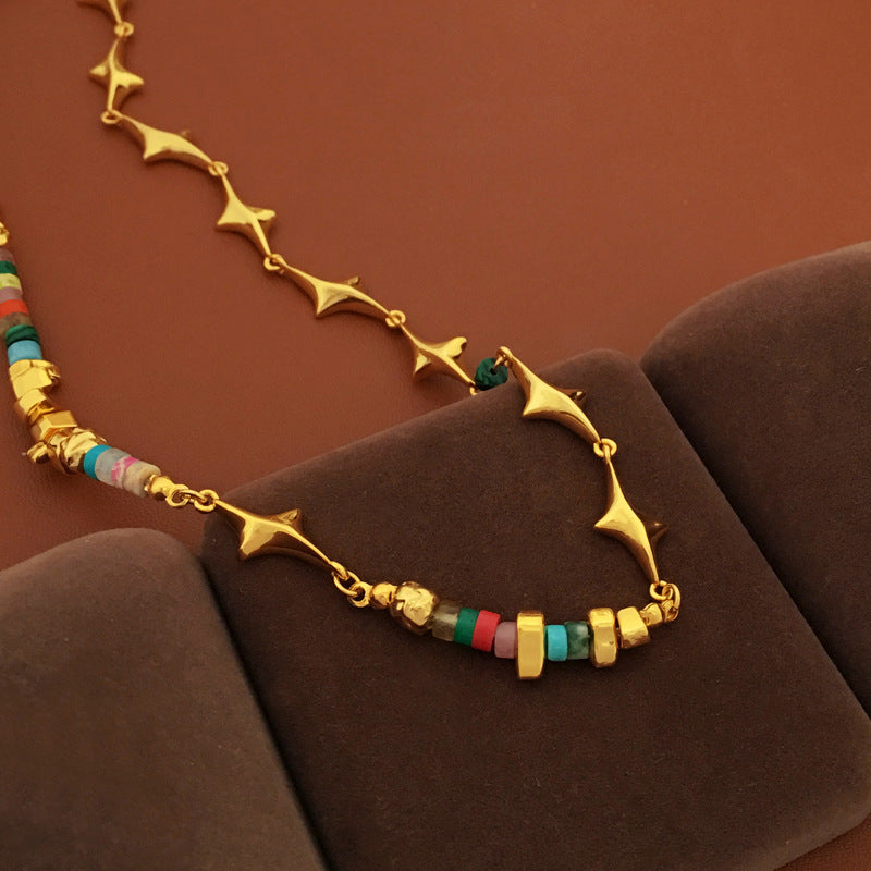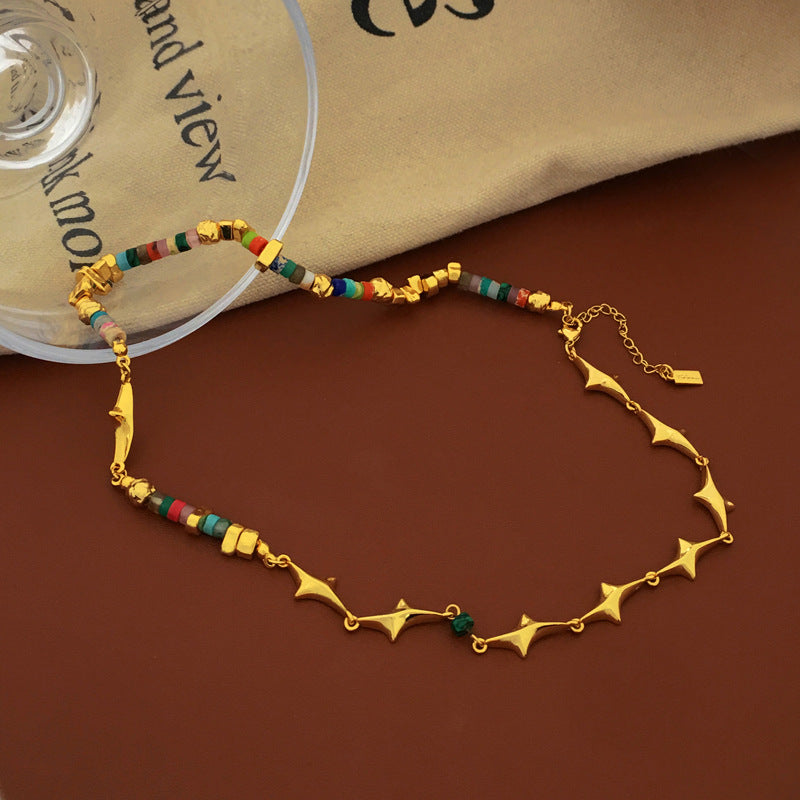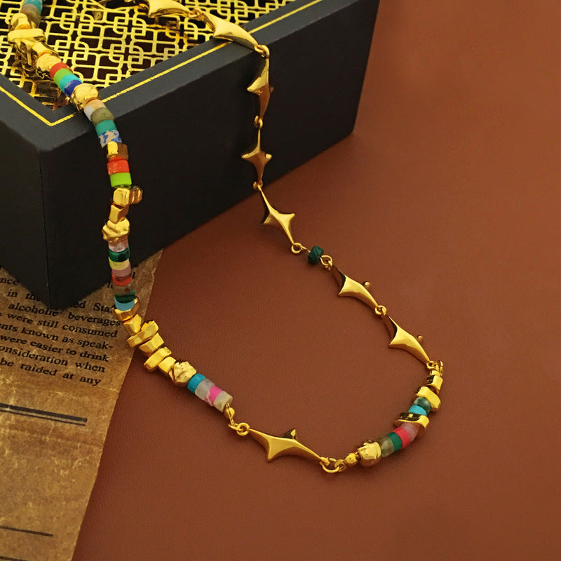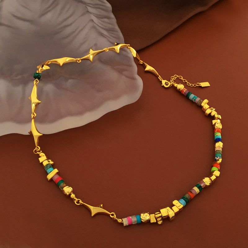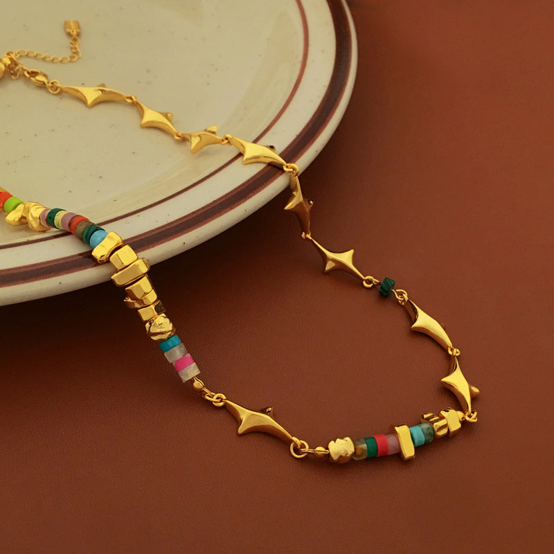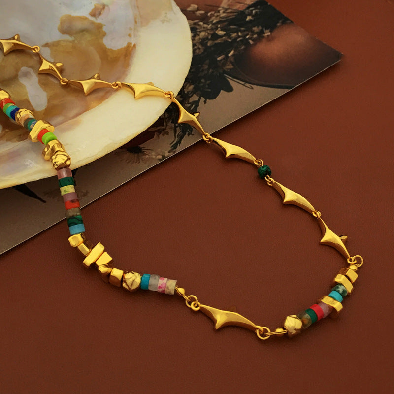 This unique necklace features an eclectic mix of irregular geometric beads, creating a mesmerizing and eye-catching design. The combination of different shapes, sizes, and colors adds a touch of ethnic and tribal-inspired flair, making it a statement piece for any outfit.