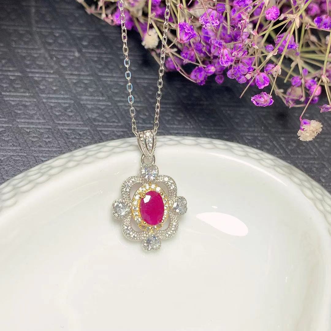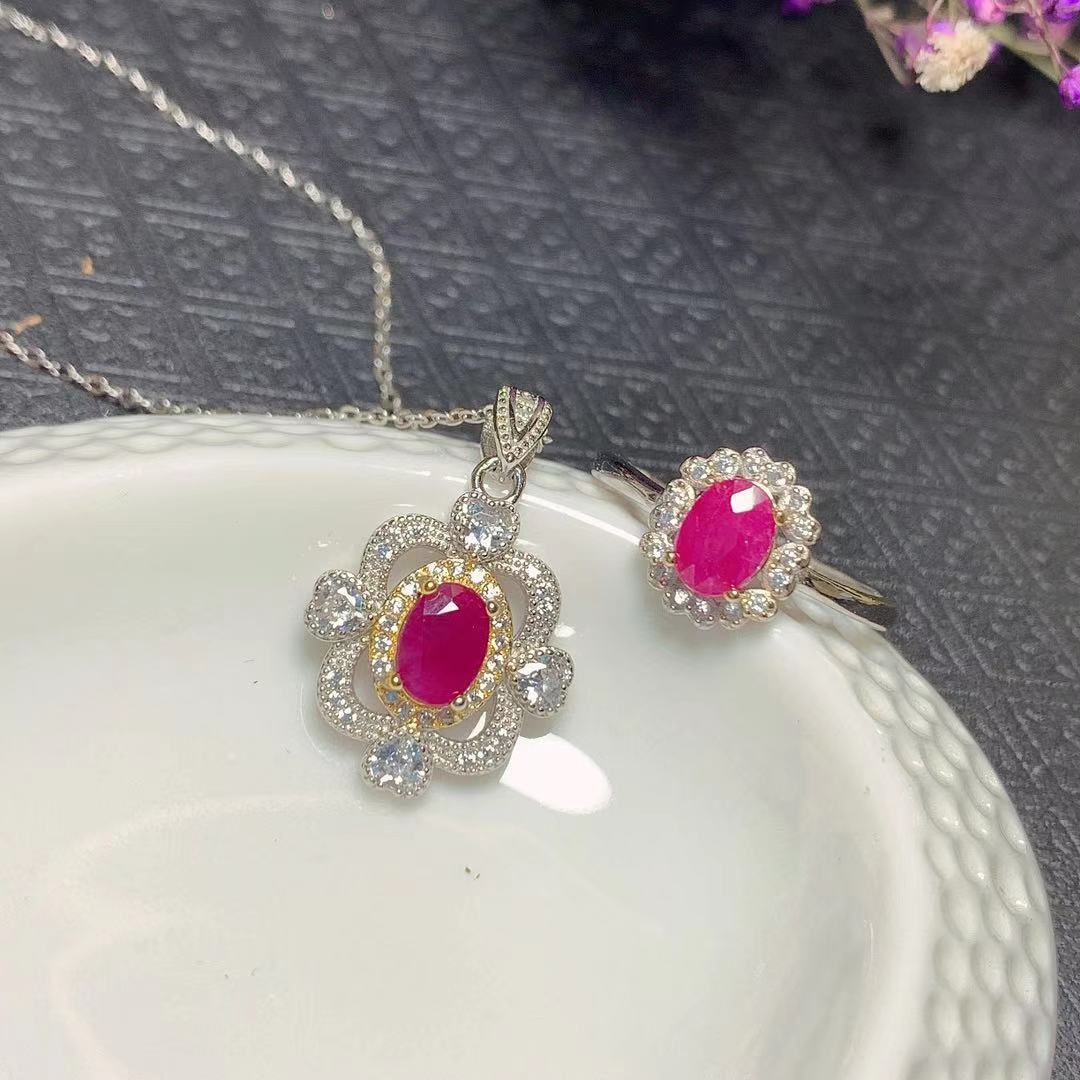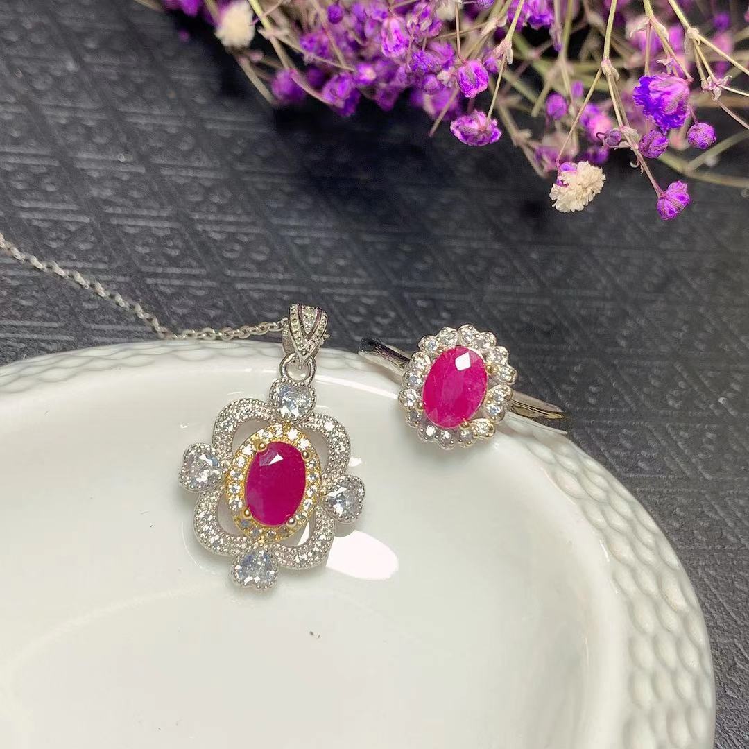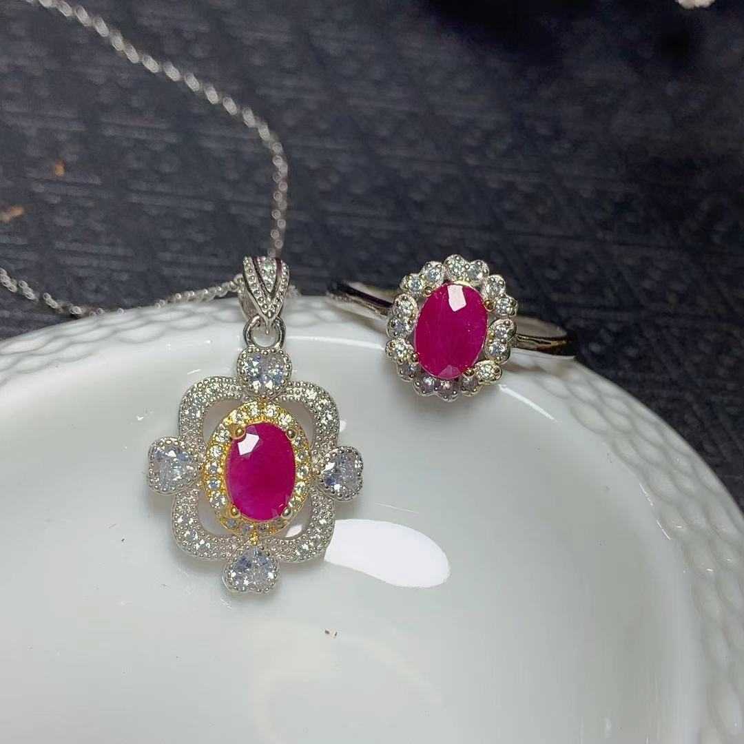 Description: Adorn yourself with elegance through this natural Burmese ruby set. The set includes an oval gemstone ring and pendant, both set in 925 silver. Experience the allure of vintage charm in this complete set.