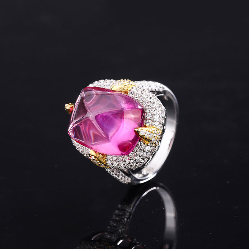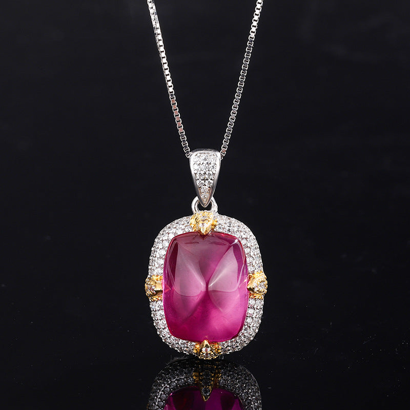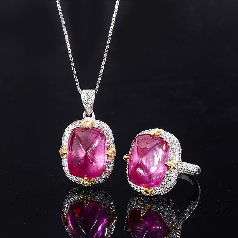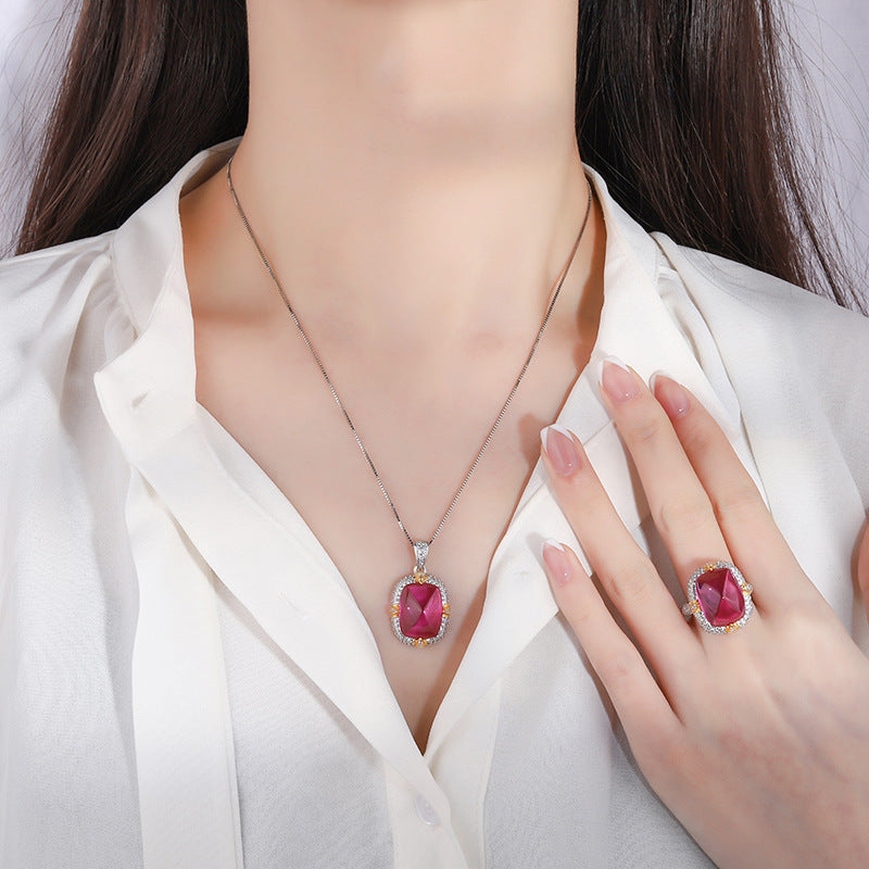 S925 Silver Imitation Colored Gemstone Rose Red Square Sugar Tower Full Diamond Pendant Ring Set Main 12*16
